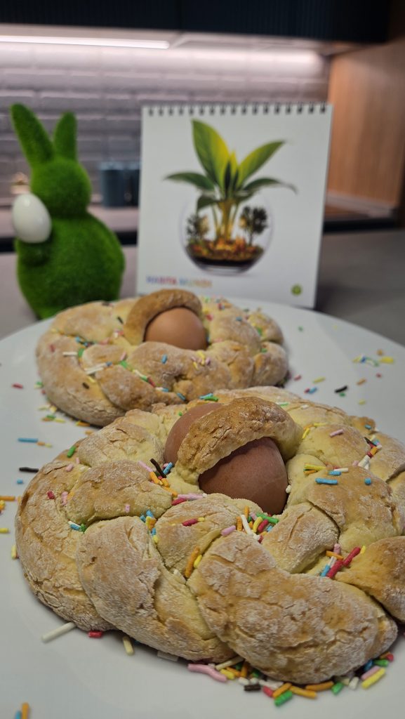 Riprendi l’impasto e metti da parte due piccoli pezzetti di pasta (serviranno per “ingabbiare” le uova). Dividi il resto in 6 parti più o meno uguali e modella dei filoncini. Intrecciateli a tre a tre, chiudendoli poi a cerchio per formare due corone.