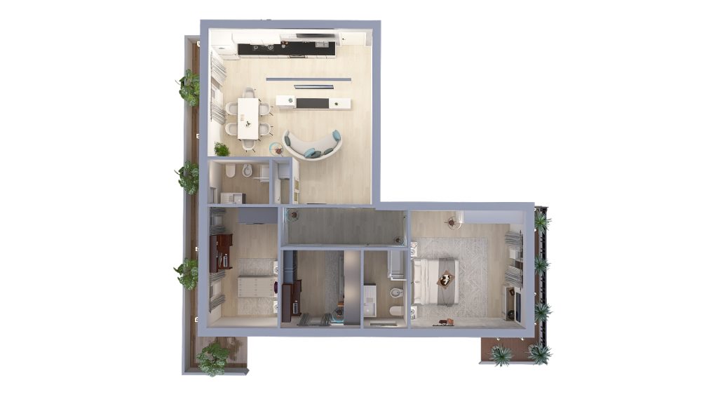 Il progetto ha ridisegnato la pianta in chiave contemporanea, puntando su fluidità e apertura. L’ingresso si apre ora direttamente su un ampio open space che accoglie cucina, zona pranzo e living in un ambiente unico e arioso. La continuità visiva diventa la cifra distintiva della nuova distribuzione, rendendo lo spazio più dinamico e conviviale.